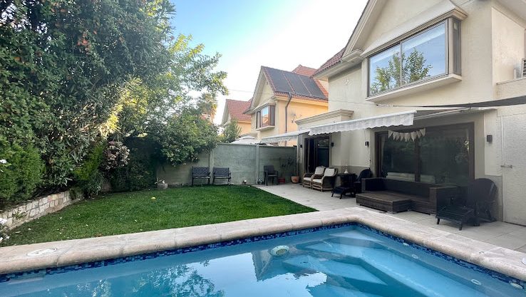 Exterior: Estacionamiento para 2 autos. Piscina con bomba de calor, césped, árboles. Terraza con todo retráctil. Bodega 25 metros cuadrados.